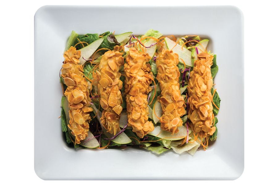 Tiras de pollo fritas con almendra acompañadas de ensalada, pera asiática y salsa agripicante.