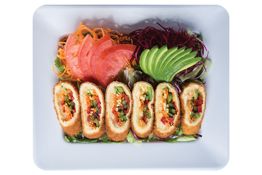 Pechuga empanizada rellena de verduras y queso manchego acompañado con ensalada.