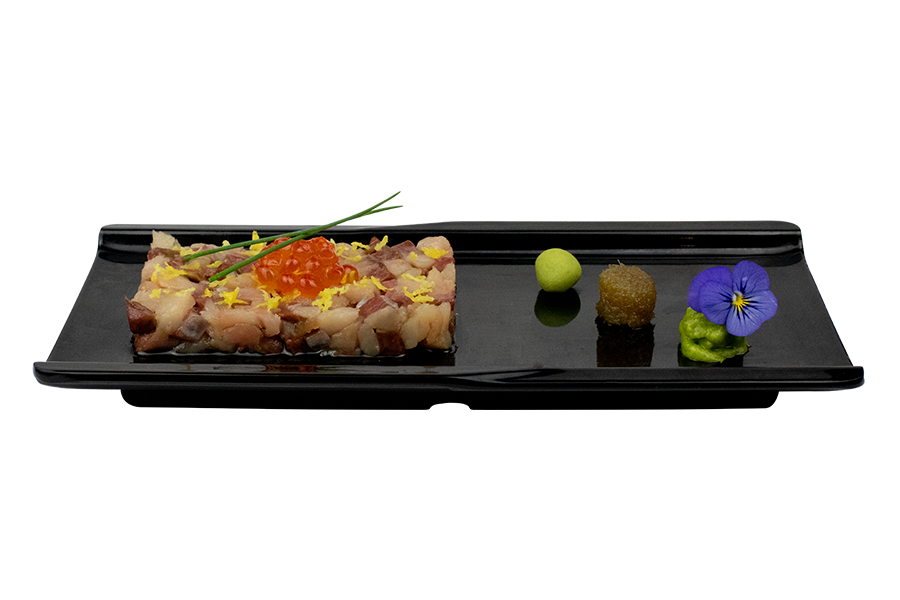 Tartar de hamachi con topping de ikura, limón eureka, acompañado de wonton frito, wasabi, jengibre dulce y puré de aguacate.