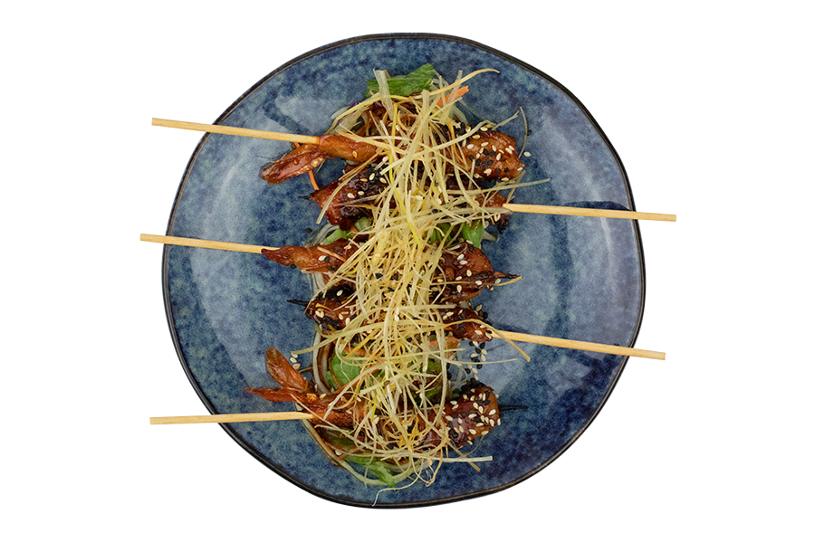 Camarones marinados en salsa gochu asados al grill, acompañados con hilo de pepino, mix de lechugas, poro frito, goma y salsa gochu.