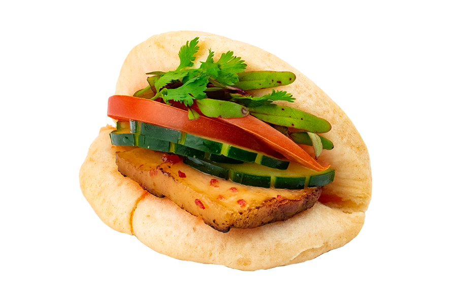 Pan al vapor relleno de pork belly, salsa agridulce, pepino, tomate, brotes de betabel y cilantro.