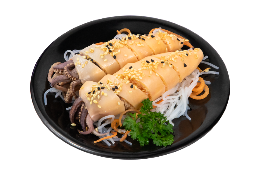 Calamar relleno de pasta baby, cama de zanahoria y harusame, bañado en salsa de anguila y ajonjolí mix.