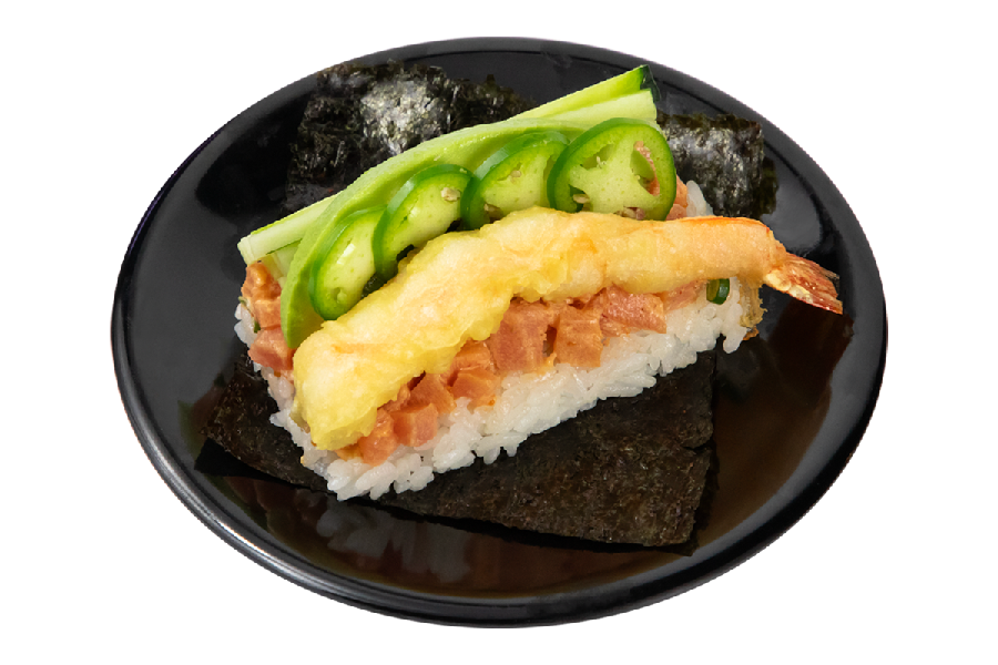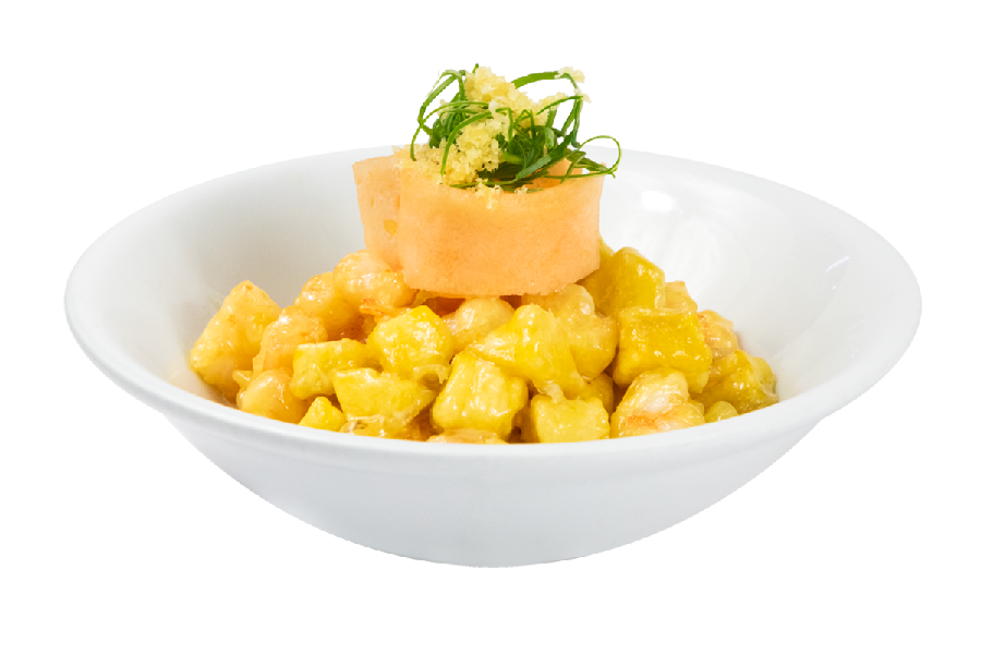 Camarones y plátano tempura, bañados en salsa bora bora acompañados de julianas de melón, cebollín y tanuki.