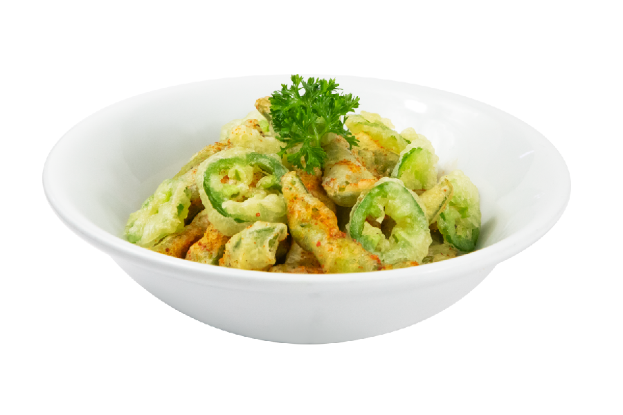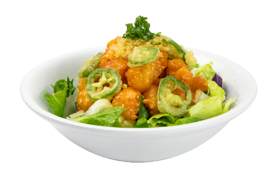 Camarones y rodajas de jalapeño tempurizado bañados con salsa de chipotle, tanuki y cebollín sobre una cama de mix de lechugas.