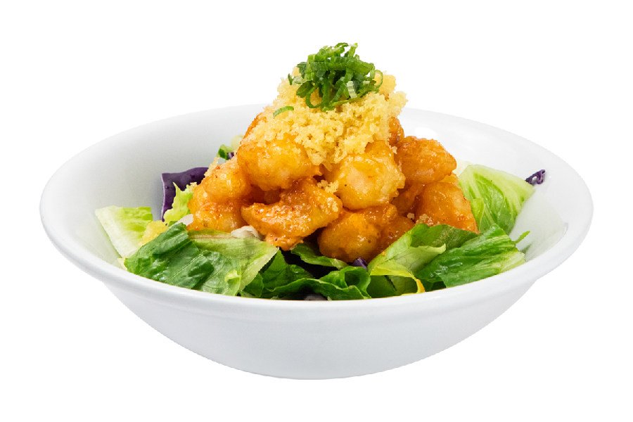 Camarones tempura bañados con salsa chipotle, tanuki, cebollín sobre una cama de mix de lechugas.