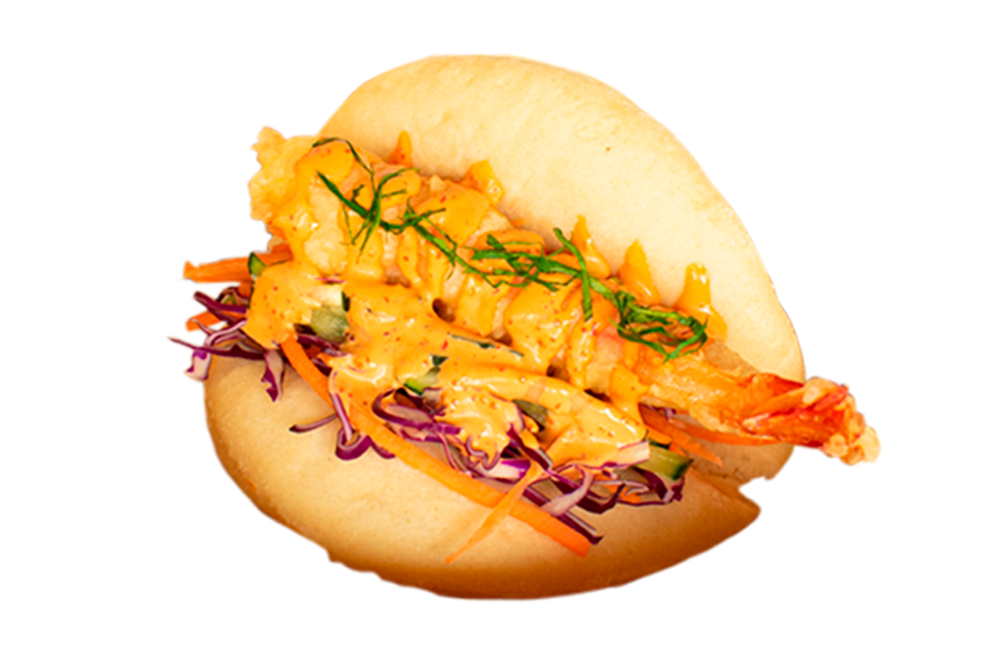 Pan al vapor, camarón tempura, ensalada de col con zanahoria, pepino encurtido, cilantro y salsa chipotle.