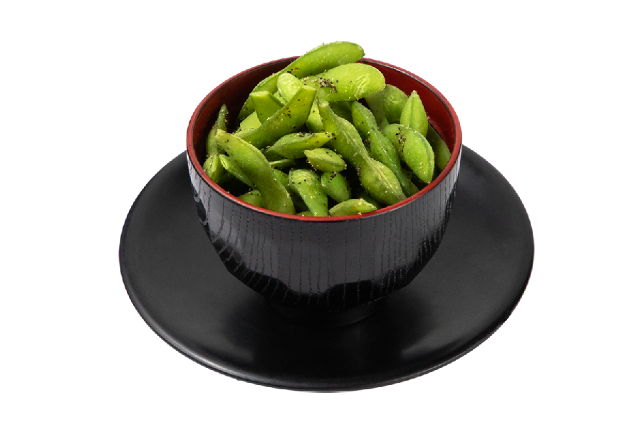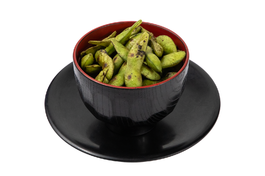 Frijol de soya en su vaina al vapor con un toque de sal, acompañado de salsa ponzu roll.