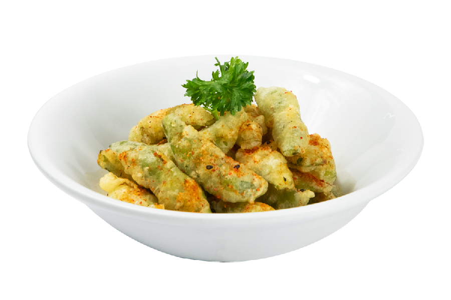 Frijol de soya en su vaina tempurizados, acompañados con un toque de sal, shichimi y salsa ponzu roll.