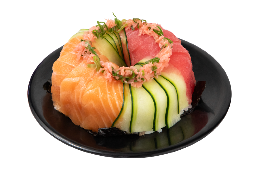 Arroz shari cubierto con salmón, atún, pepino, acompañado de salsa ponzu, gari y cebollín.