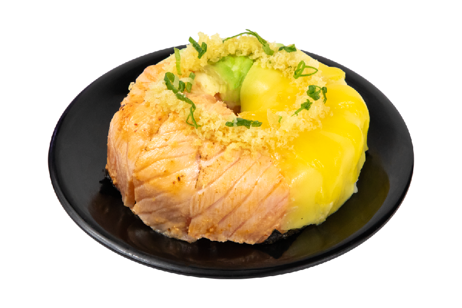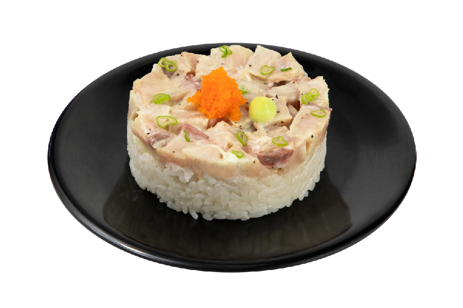 Arroz shari cubierto con salmón, aguacate, mango, acompañado de salsa chipotle, cebollín picado, salsa yuzu mango y tanuki.