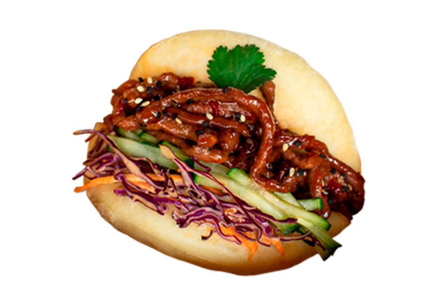 Pan al vapor, filete de res, salsa lao chao, ensalada de col con zanahoria, pepino encurtido, cilantro y ajonlolí mix.