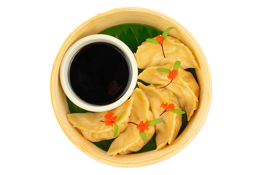 Raviol de vegetales acompañado de vinagreta de soya, pueden ser preparados fritos, al vapor o asados.
