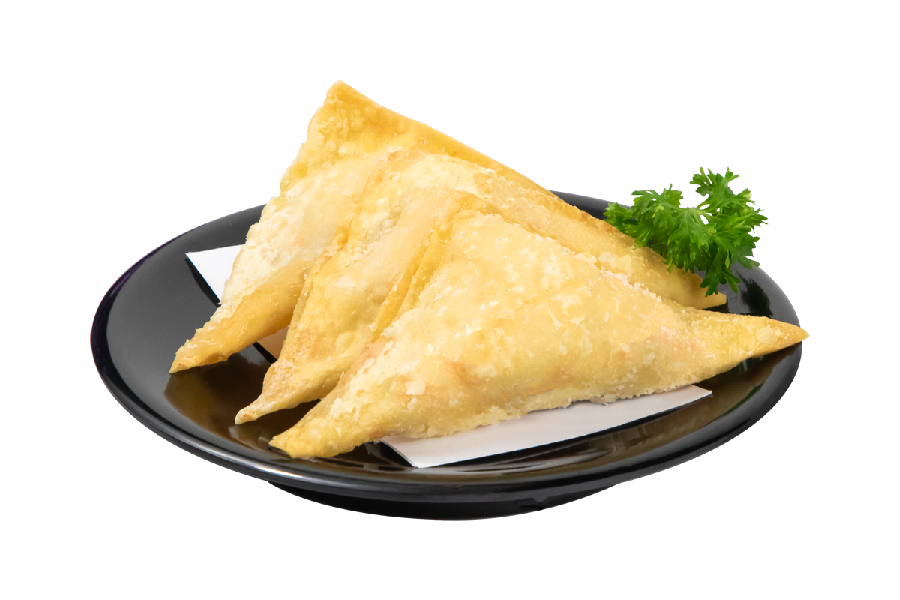 Raviol de salmón con queso crema acompañado de vinagreta de soya; pueden ser preparados fritos, al vapor o asados.