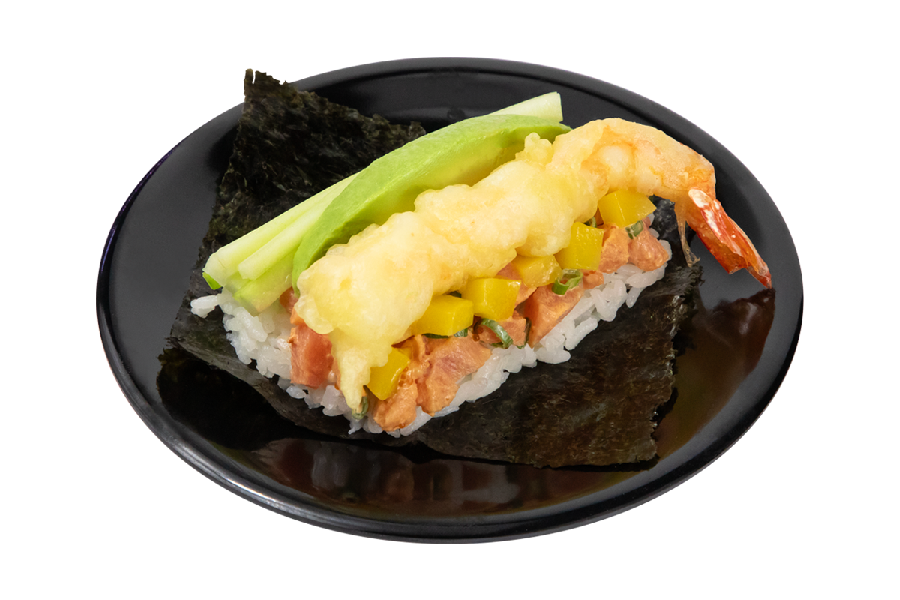 Taco de alga nori con camarón tempura, tuna spicy, mango, aguacate, pepino, arroz sushi y cebollín.