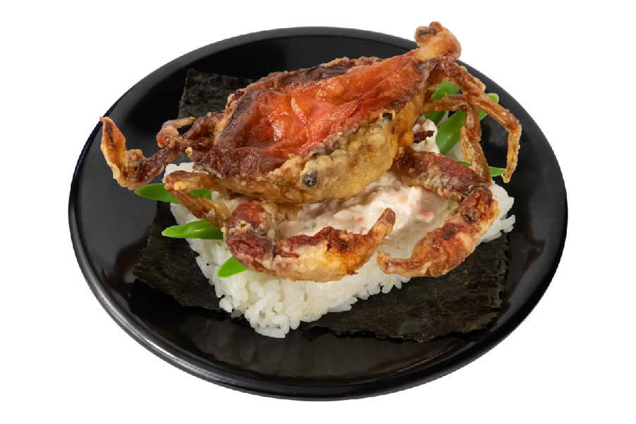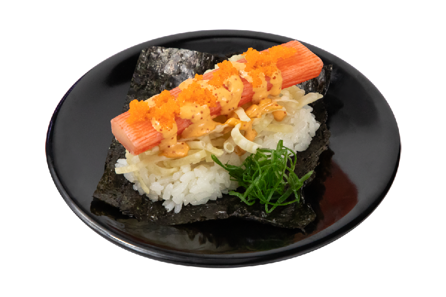 Taco de alga nori con kanikama, julianas de wonton frito, arroz sushi, masago y salsa de chipotle y cebollín.