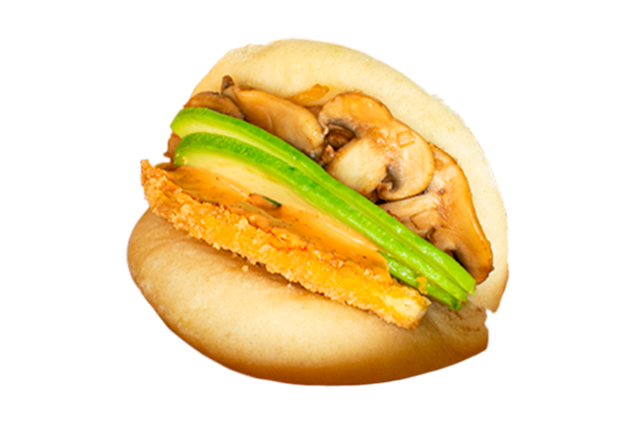 Pan al vapor, pollo empanizado, aguacate, jícama, champiñón, cebolla y salsa chipotle.