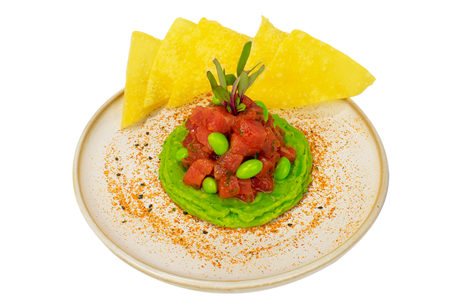 Tartar de atún (importado) con salsa ponzu, teriyaki, edamames, cilantro en una base de guacamole y brotes de betabel, acompañado de tostaditas de won ton.
