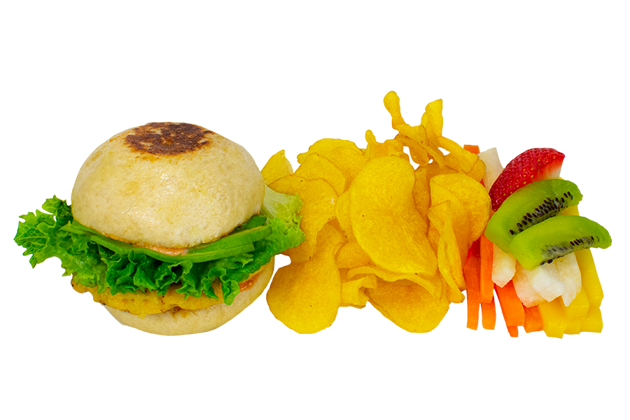 Hamburguesa de carne de pollo en pan bao, aderezo de la casa, aguacate, lechuga, con papas fritas y fruta.