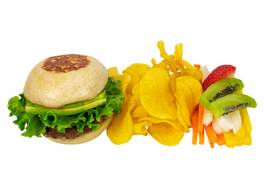 Hamburguesa de carne de res en pan bao, aderezo de la casa, aguacate, lechuga, con papas fritas y fruta.