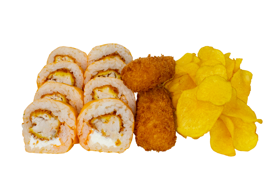 Rollito de arroz en mamenori (hoja de soya) relleno de pollo empanizado, con kushiagues de queso y papas fritas.