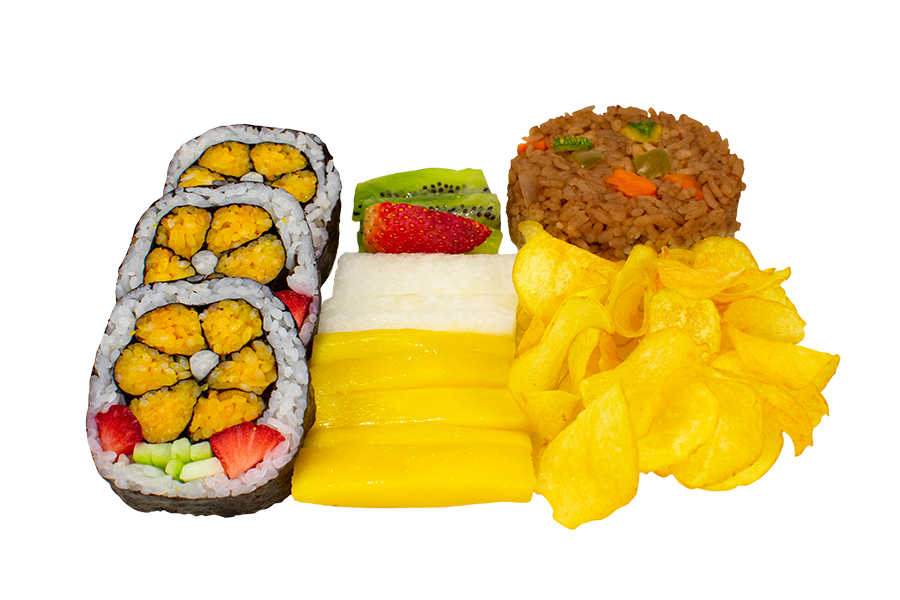 Rollo de sushi mosaico con arroz, fruta y papas fritas.