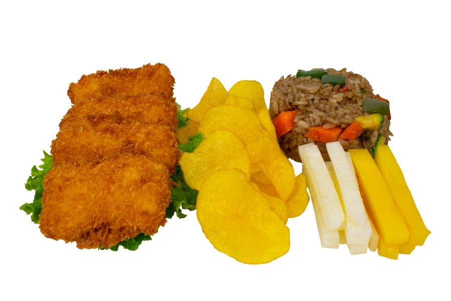 Escalopas de pescado empanizado, papas fritas, arroz frito y fruta.