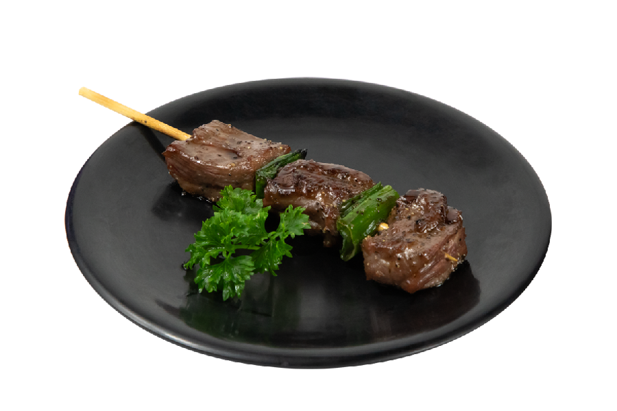 Brocheta de arrachera cocinada al grill bañada en salsa yakitori.