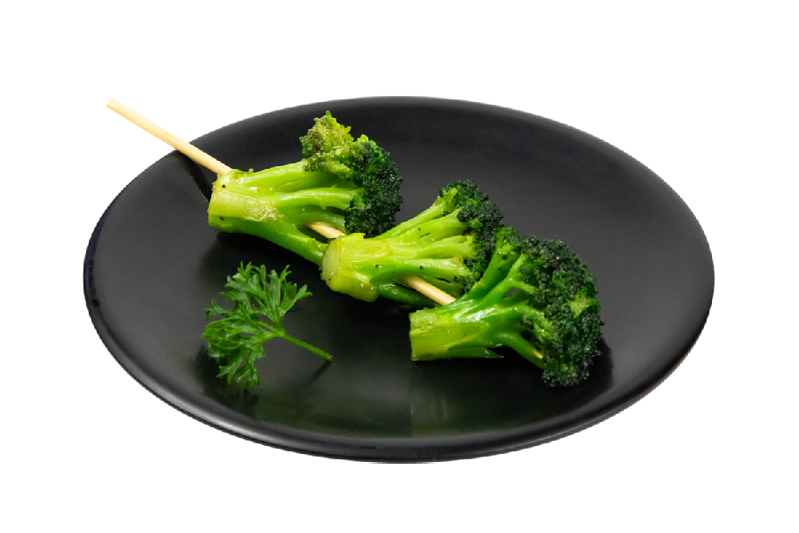 Brocheta de brócoli cocinada al grill bañada en salsa yakitori.