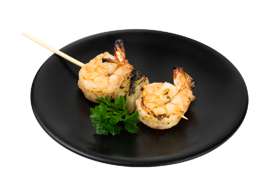 Brochetas de camarón cocinada al grill bañada en salsa yakitori.