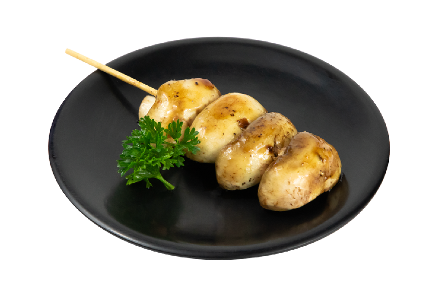 Brocheta de champiñón cocinada al grill bañada en salsa yakitori.