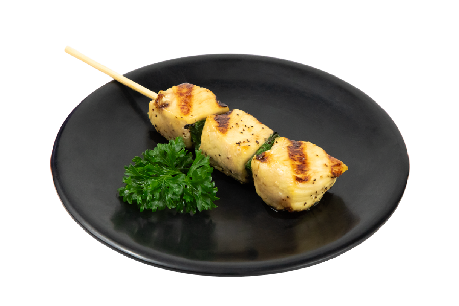 Brocheta de pollo cocinada al grill bañada en salsa yakitori.
