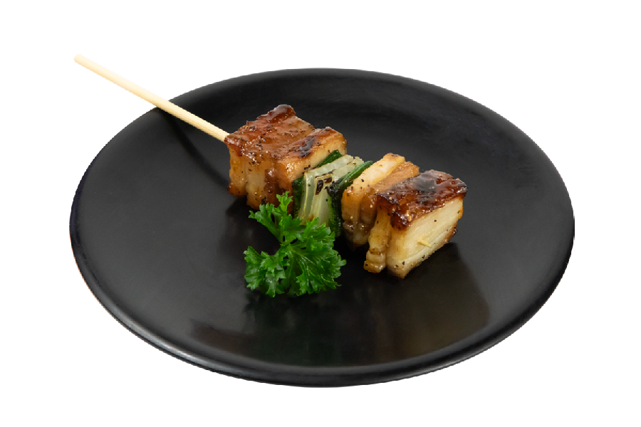 Brocheta de pork belly cocinada al grill bañada en salsa yakitori.