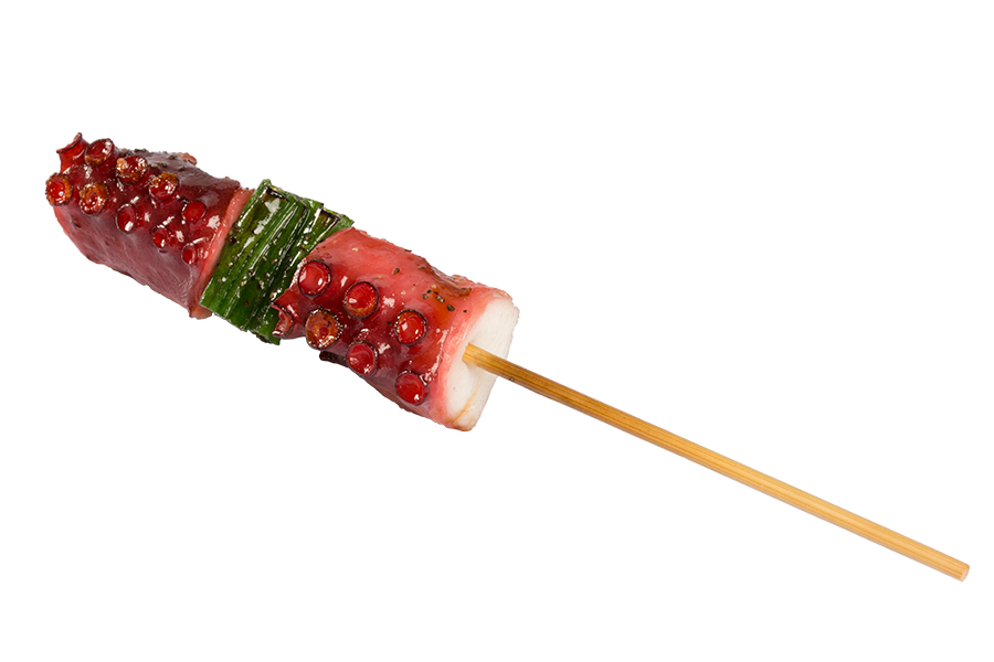 Brocheta de pulpo cocinada al grill bañada en salsa yakitori.