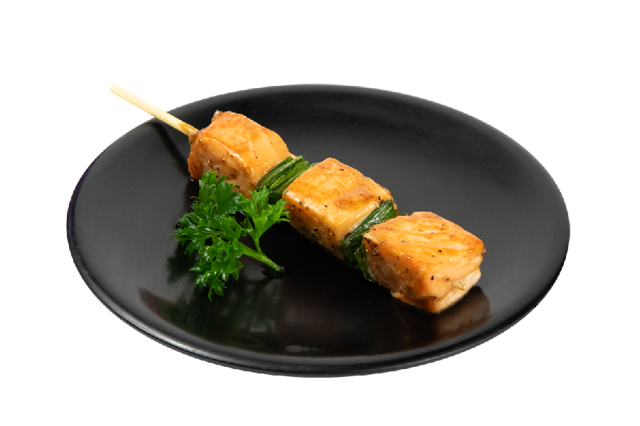 Brocheta de salmón cocinada al grill bañada en salsa yakitori.